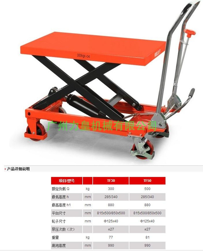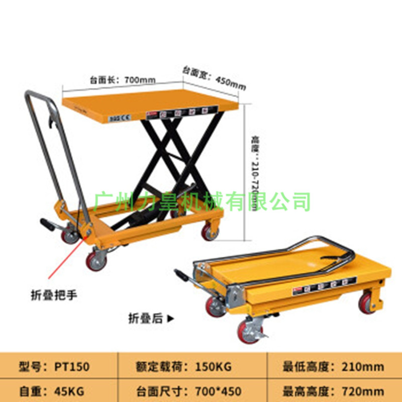 备注:整体泵,单剪叉平台车。(折叠手柄选配)